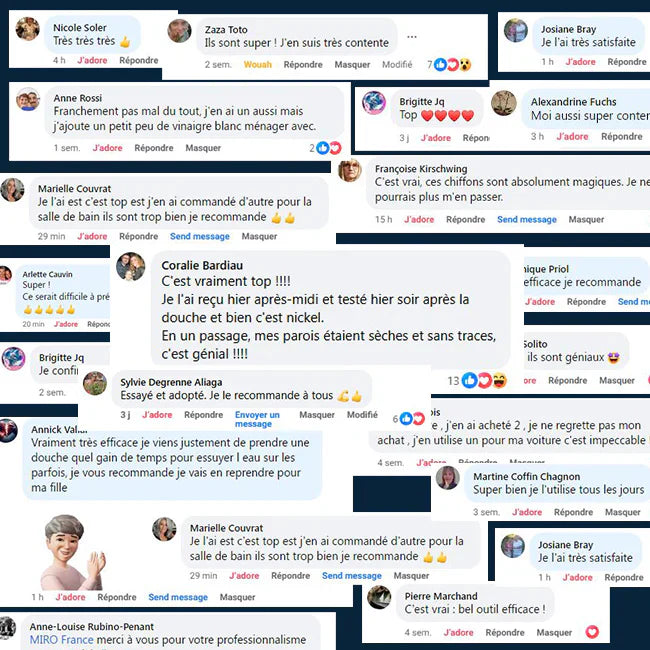 "J'étais assez sceptique avant de commander mais je me suis dis pourquoi pas tester (surtout au vu de l'offre spéciale...). Et bien je tiens à vous dire qu'ils sont juste magique 😍 Ces chiffons absorbent absolument tout instantanément. Je gagne énormément de temps et ils me simplifie la vie. Je recommande!!" Julie D. (Montreal)