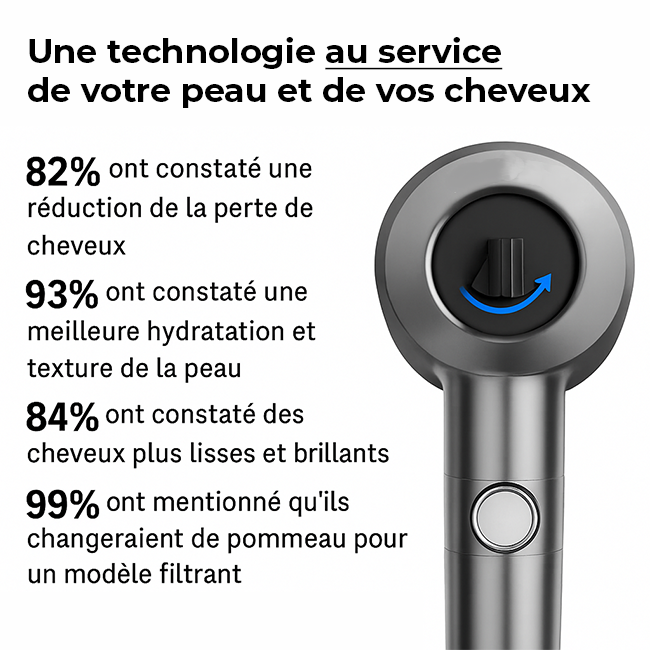 Savez-vous à quel point votre pommeau de douche est sale ? La plupart des pommeaux de douche ne filtrent pas les toxines, les métaux et les produits chimiques. Cela entraîne une peau sèche et rugueuse et perturbe l'équilibre du pH. Découvrez le pommeau de douche Lumea Shower™, qui transforme votre douche en quelques secondes. Il augmente la pression de l'eau de 200% tout en économisant de l'argent sur vos factures d'eau. Purifiez votre eau dès aujourd'hui et aidez à revitaliser votre peau et vos cheveux, tout en éliminant l'huile et les résidus de chlore dans l'eau.